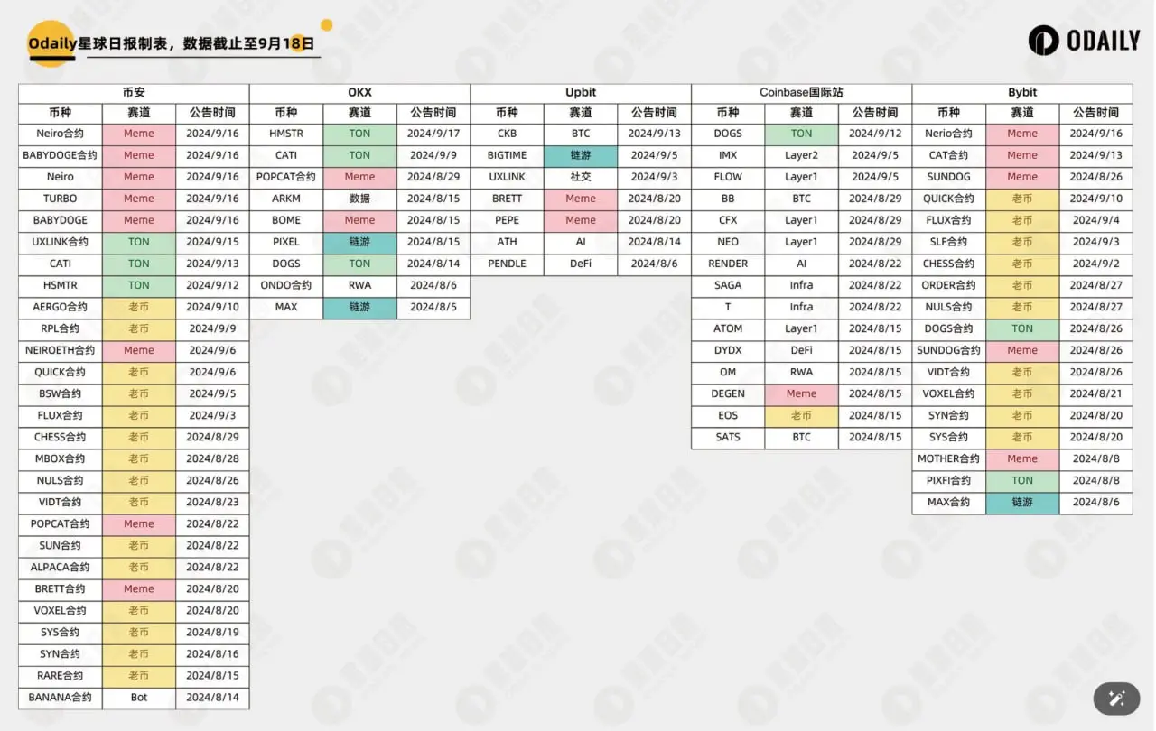 这张图很有意思,现在从用户的角度来看,层出不穷的 meme 和 Ton 小游戏项目几乎吞噬了整个市场。很多人把矛头指向了币安,认为是它带坏了风气,但仔细一看,各大交易所的步调出奇地一致,大家都在做同样的事情,真是“五十步笑百步”。
