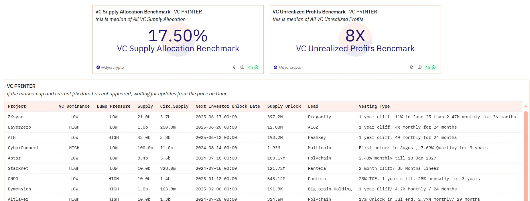 正如上图所示,即便是在市场遭遇持续下跌的状况下,各大 VC 在这些代币的投资上账面价值仍有着数十倍甚至近百倍的浮盈,VC 整体的未实现利润仍高达 8 倍。