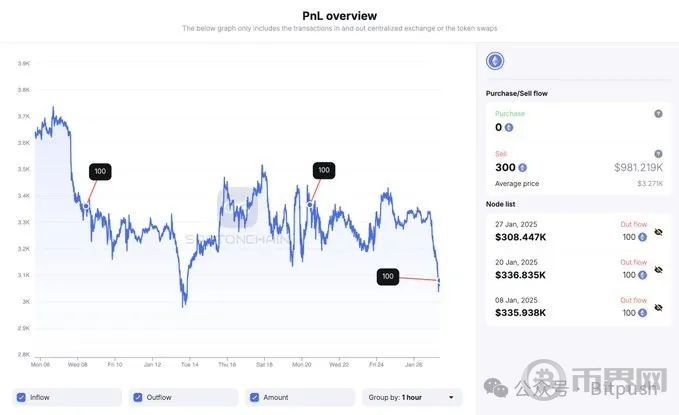 以太坊基金会(EF)一直在断断续续出售ETH,近日又出售了100枚ETH,价值约307,893美元。区块链分析公司SpotOnChain的数据显示,这是基金会2025年进行的第三次ETH抛售。今年1月份,EF共出售了300枚ETH(截至1月27日数据),价值约981,200美元。市场观察人士指出,基金会的抛售行为给以太坊的价格带来了压力。截至发稿时,ETH交易价格略高于3,000美元,30天跌幅超7%。不过,以太坊基金会仍持有大量ETH储备。根据Arkham Intelligence的数据,基金会拥有269,175枚ETH,价值约8.17亿美元。