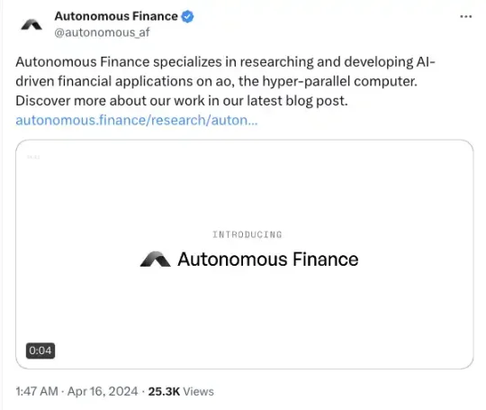 AI 代理将在解决链上市场中发挥关键作用。Autonomous Finance 正在构建一个全面的框架和终端用户 dApps,以在 AO 上原生支持这一功能。他们专注于在超并行计算机 ao 上研究和开发人工智能驱动的金融应用程序。