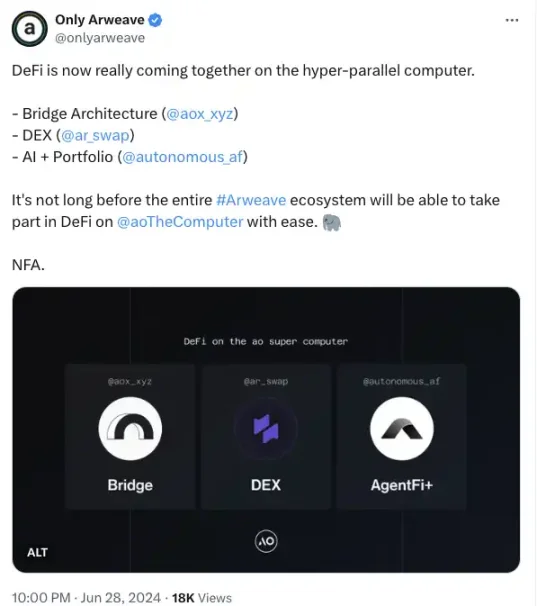 解锁在 AO 上市值 20 亿美元的 AR 代币流动性,似乎是新生态系统的一个很好的起点。这已经在进行中,现在就使用 $wAR 吧!DeFi 现在正在超并行计算机上逐步整合。桥接架构 (AOX)、去中心化交易所 (ArSwap)、人工智能 + 投资组合 (Autonomous Finance),不久之后,整个 Arweave 生态系统将能轻松参与 AO 上的 DeFi。