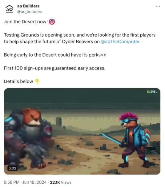 链上游戏:AO 非常适合处理计算密集型的完全链上游戏。平台上已经有游戏在开发中——快去看看 @LlamaLandAO 和 Cyber Beavers!