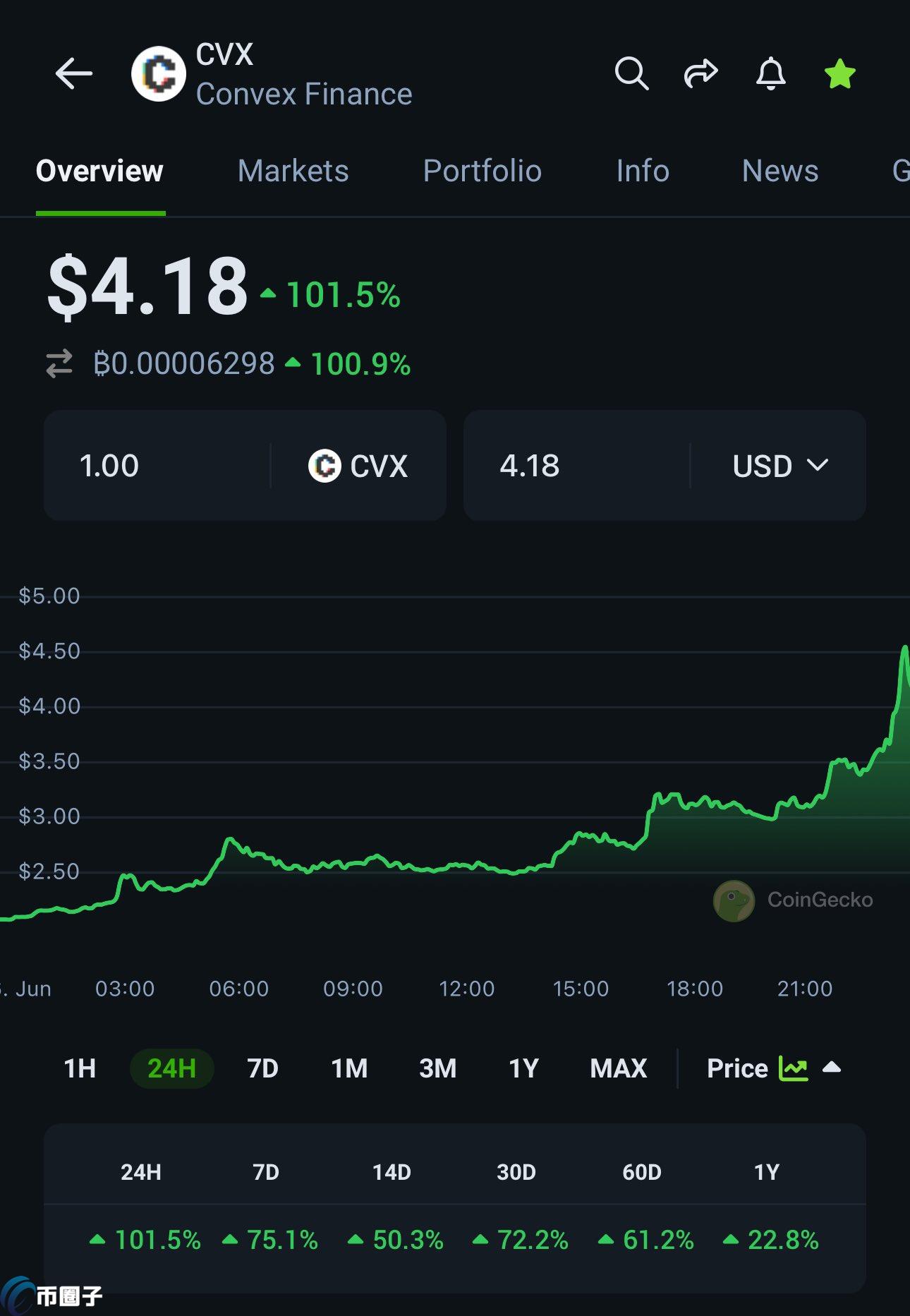 与此同时,Curve上的收益聚合器Convex Finance的代币CVX可谓是风头正劲。就在今天,CVX的价格飙升了超过100%,这可真是引起了市场的广泛关注。更令人惊讶的是,6月16日,CVX在Binance的CVX/USDT现货交易对的交易量达到了3200万美元,创下了历史单日新高。
