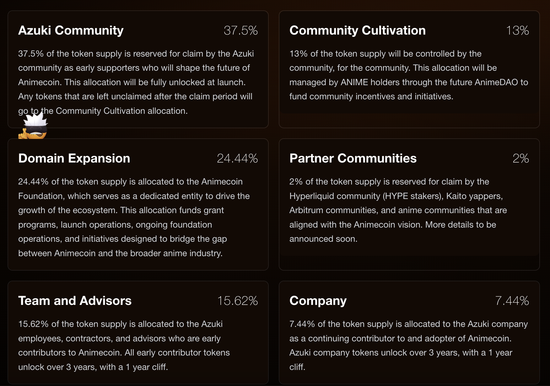 Anime代币的总供应量为100亿枚,初始流通量为76.9亿枚(占总供应量的76.9%)。代币的分配方案如下:Azuki社区将获得37.5%,AnimeDAO占13%,Animecoin基金会持有24.44%,合作社区占2%,团队和顾问占15.62%(一年锁定期后解锁33.33%,剩余部分线性解锁),Azuki公司占7.44%(一年锁定期后解锁33.33%,剩余部分线性解锁)。Hyperliquid社区、Kaito yappers和Arbitrum社区等也将获得空投。