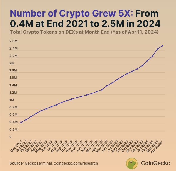 到了2024年,市场上已经有超过250万种加密货币,比2021年的44万种增长了5.7倍。到了2022年底,这个数字已经达到了115万,同比增长了159.2%;到了2023年底,又进一步增加到198万,同比增长了72.3%。这真是让人眼花缭乱啊!