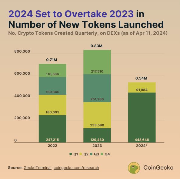截至2024年4月初,已经有超过54万个新代币被创建,平均每天有5300个新代币诞生。从2023年开始,这个速度已经超过了83万个新代币的一半。真是让人应接不暇啊!