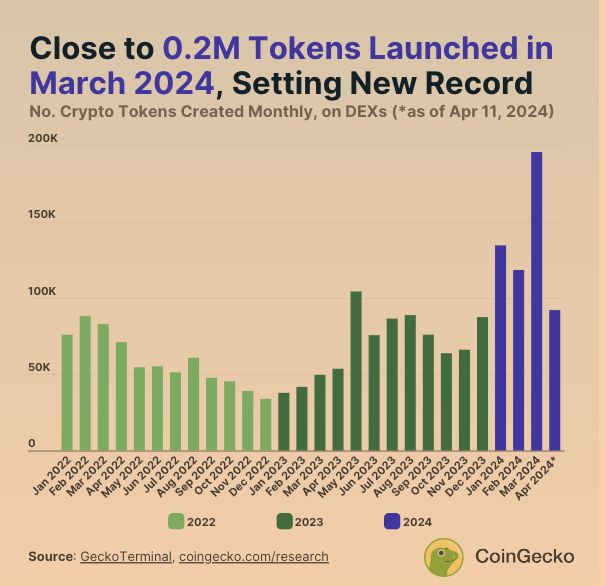2023年5月创下了104k代币发行的记录,而2024年3月更是达到了196k的新高。这些激增突显了Meme市场的活跃程度,这个市场中,各种主题和衍生代币迅速涌现,真是让人眼花缭乱。