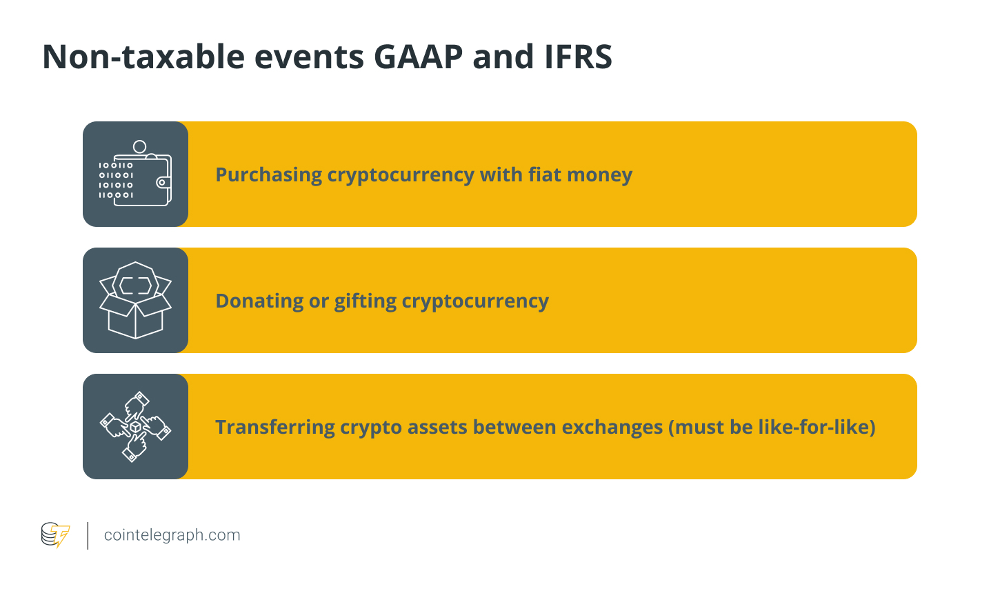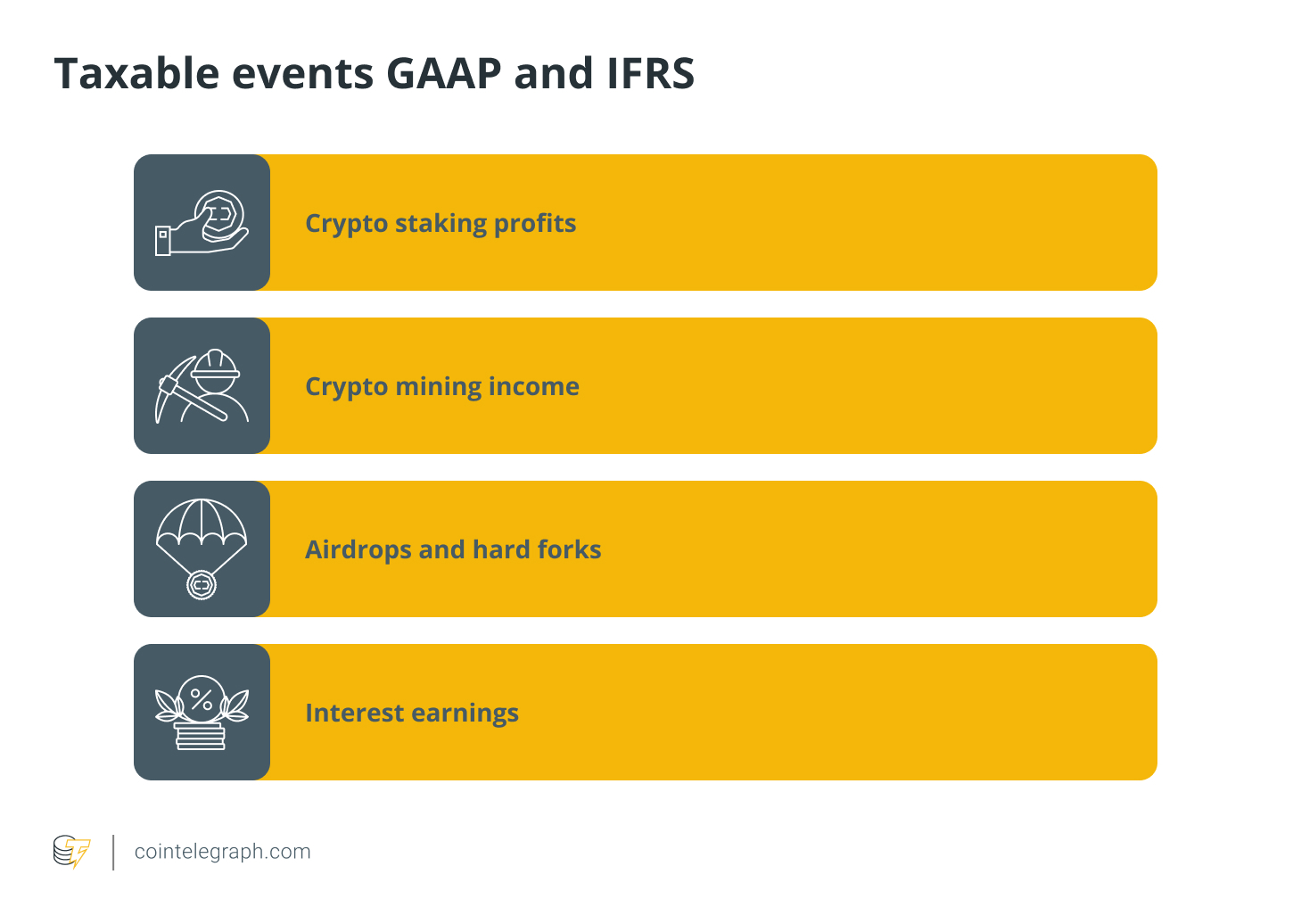 根据GAAP和IFRS规定,导致企业根据资产的公平市场价值缴纳所得税的应税事件包括挖矿收入、用加密货币支付员工薪酬等。这些活动将作为普通业务收入征税,但相关的费用可以扣除。这就像经营一家公司,所有收入和支出都需要记录并相应地纳税或扣税。