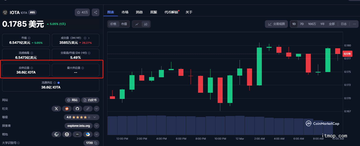 埃欧塔币(IOTA)首次亮相是在2020年11月27日,那天的开盘价是0.00015美元,众筹价格也一样。总共发行了36.6亿IOTA,目前流通的有3,669,672,848 IOTA,流通率达到了100%。截至2025年3月12日,IOTA的价格是0.1785美元,历史最高价曾经达到过5.69美元,而最低的时候是0.07962美元。