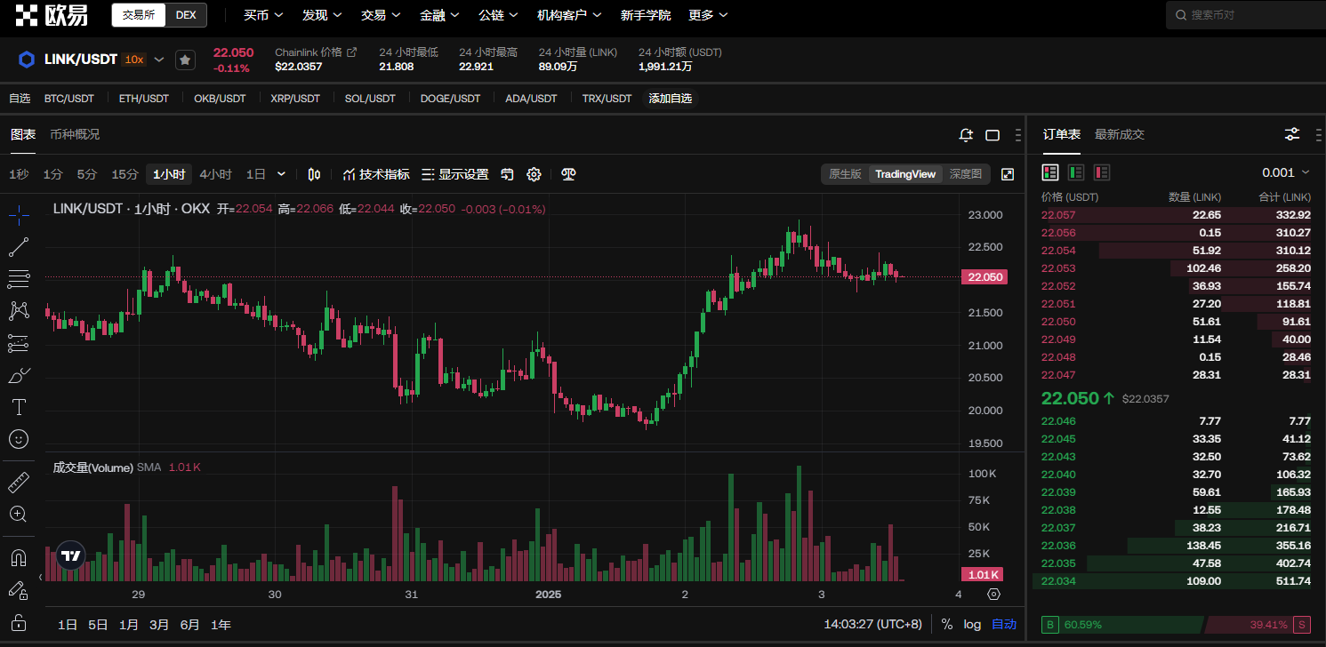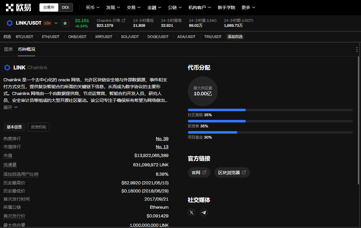 在区块链行业中,link币确实被视为龙头币之一。这主要是因为Chainlink在预言机领域的领先地位和广泛的应用场景。Chainlink为智能合约提供了可靠且安全的数据输入服务,这极大地丰富了区块链的应用场景。随着去中心化金融(DeFi)生态的持续繁荣,对预言机服务的需求不断增加,Chainlink凭借其卓越的技术实力和多元化的应用场景,成功在市场中占据了领先地位。从市场份额、知名度及技术实力等多个维度来看,link币都展现出了龙头币的风采。截至2025年1月3日,link的最新价格为22.050美元,市值排行13,市值为13,922,065,389美元,流通量为631,099,972 link,添加自选用户比例8.38%,历史最高价是52.9920美元。