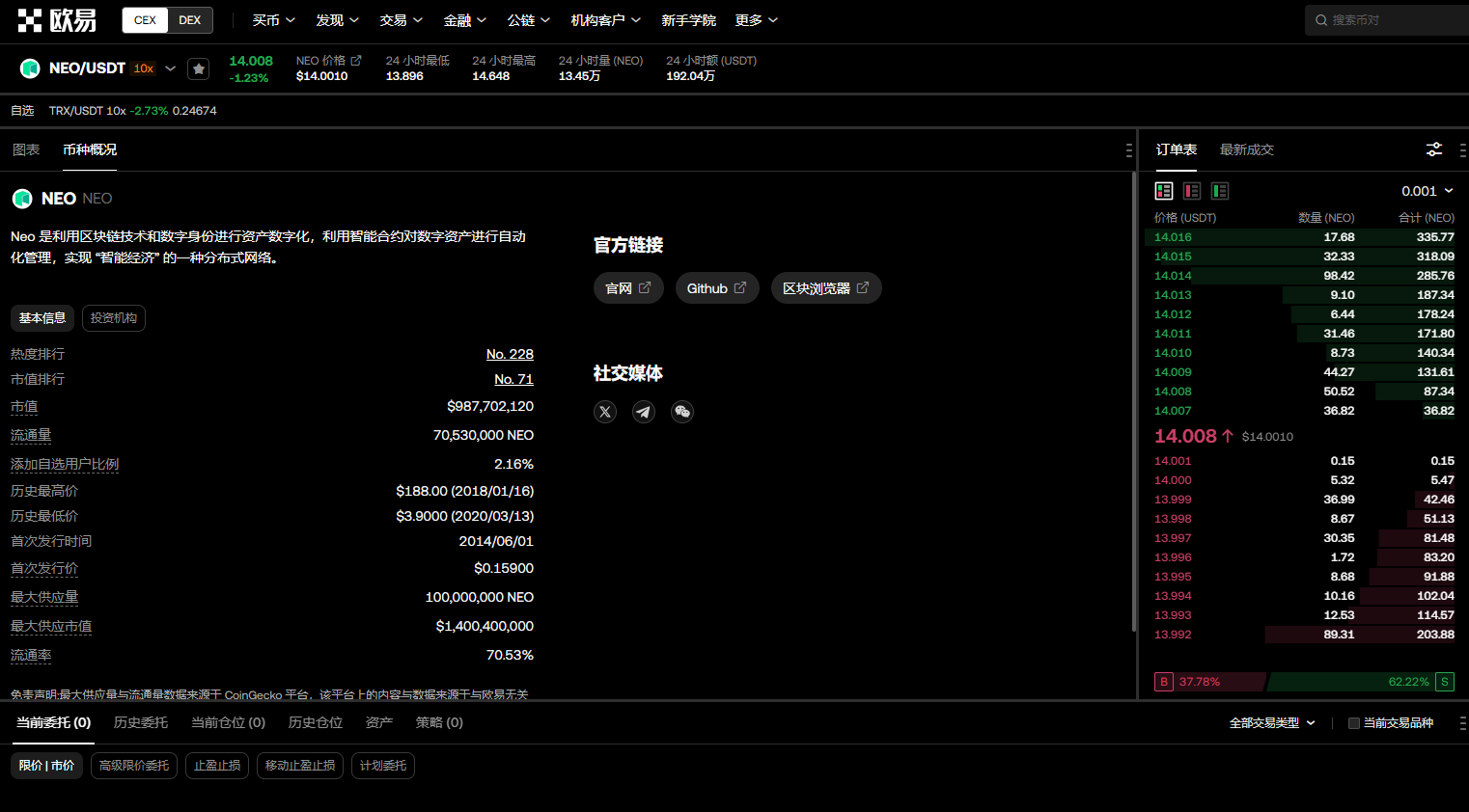 根据欧意交易所的数据,截至2025年1月23日,neo的最新价格约为14.008美元。这一价格相较于其首次发行时的0.159美元,已经上涨了约88倍。从历史数据来看,neo曾在2018年1月16日达到过最高价188美元,相比发行价上涨了1182倍,而在2020年3月13日的最低价为3.9美元,相较于最低价上涨了约3.6倍。由此可见,neo确实经历了一次千倍币的传奇之旅。