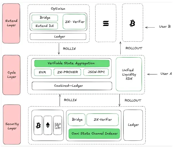 Cycle Network的核心技术利用基于可验证状态聚合(VSA)的多层架构,结合安全层、扩展层和Cycle层,以促进无缝的跨链交易。系统使用zk-rollup技术将交易汇聚成批,这些批次随后由zk-rollup节点处理,生成zk证明以验证交易而不暴露其详细信息。可验证聚合排序器对这些批次进行排序和打包,确保交易的高效处理。
