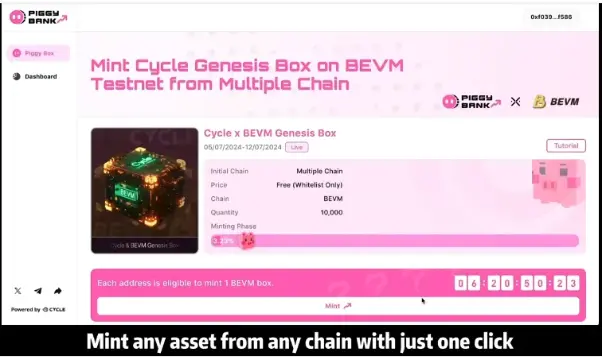与BEVM的合作——首个完全去中心化的EVM兼容比特币L2,使用BTC作为燃料——突显了Cycle Network的无桥解决方案的强大。短短三天内吸引了40K新用户,他们能够无缝铸造BEVM Genesis Boxes,完全无需处理跨链操作或手续费。这一成就展现了Piggy Bank在现实应用中的优势和易用性。