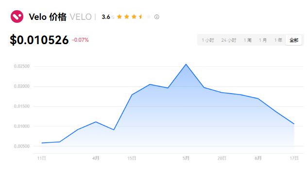 24小时最低价为 $0.0097770,当前价格为 $0.010526,24小时最高价为 $0.011876。热度排行第34位,市值排行第196位,市值为 $7,777.00万。添加自选人数的百分比为1.94%。历史最高价为 $2.3620,相比当前价格下跌了-99.56%(-$2.3515),这一历史最高价出现在2021年3月8日(3年前)。历史最低价为 $0.00097000,相比当前价格上涨了+985.15%($0.0095560),这一历史最低价出现在2022年12月7日(2年前)。首次发行时间为2020年9月17日,首次发行价为$0,流通总量为7,390,475,595 VELO,流通市值为$2.53亿。