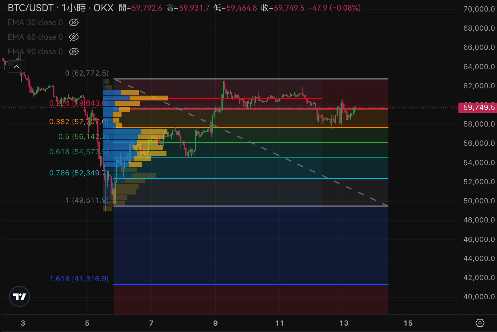 从技术分析的角度来看,这次的回调在斐波那契0.382水平得到了支撑,并成功反弹。然而,在60,700美元的位置又遇到了阻力。如果比特币能在这个区间内持续盘整,积累足够的动能,说不定还能再创新高。不过,考虑到通常只有在非常强势的情况下,回调才会如此迅速地在0.382水平反弹,因此也不排除比特币会进一步下探至54,500美元(即斐波那契0.618水平以及交易密集区)进行测试。