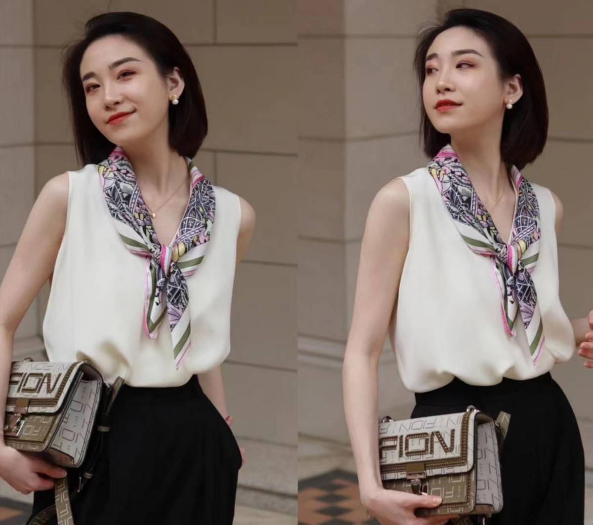 如果觉得整体的服装搭配没有新意,不妨在颈部佩戴不同样式的印花丝巾,越是色彩单一、越是领口偏大的衬衫,越是需要这种简单的配饰的点缀。