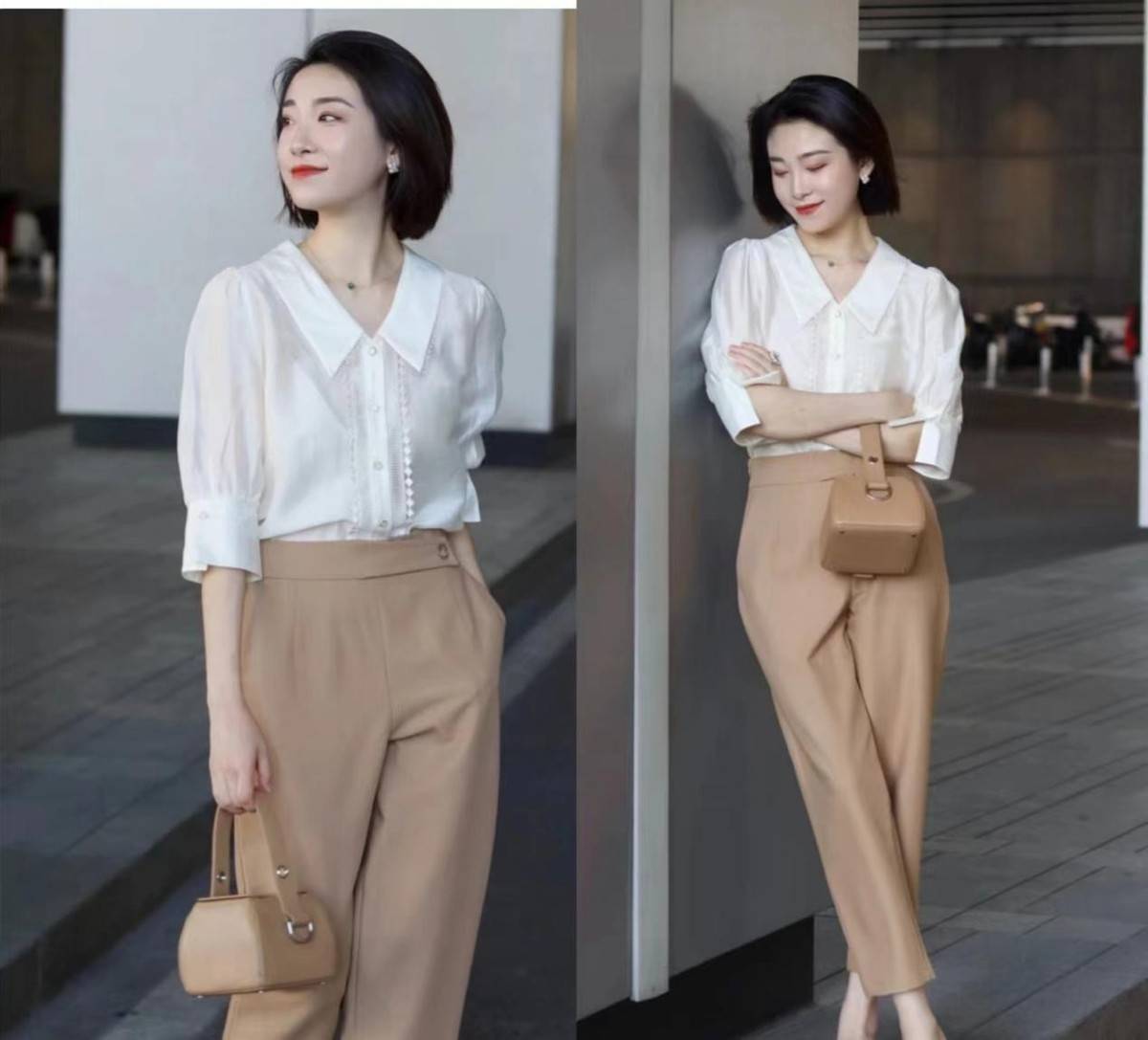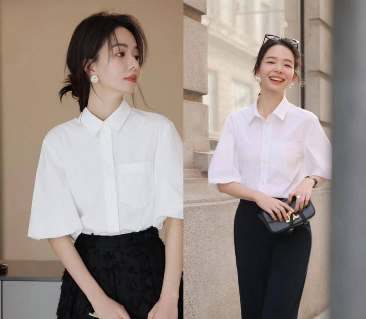像这款简单的白色短袖衬衫,它就可以帮助女性以一个自信的姿态迈入到职场之中,单品之间的结合十分的省时省事。