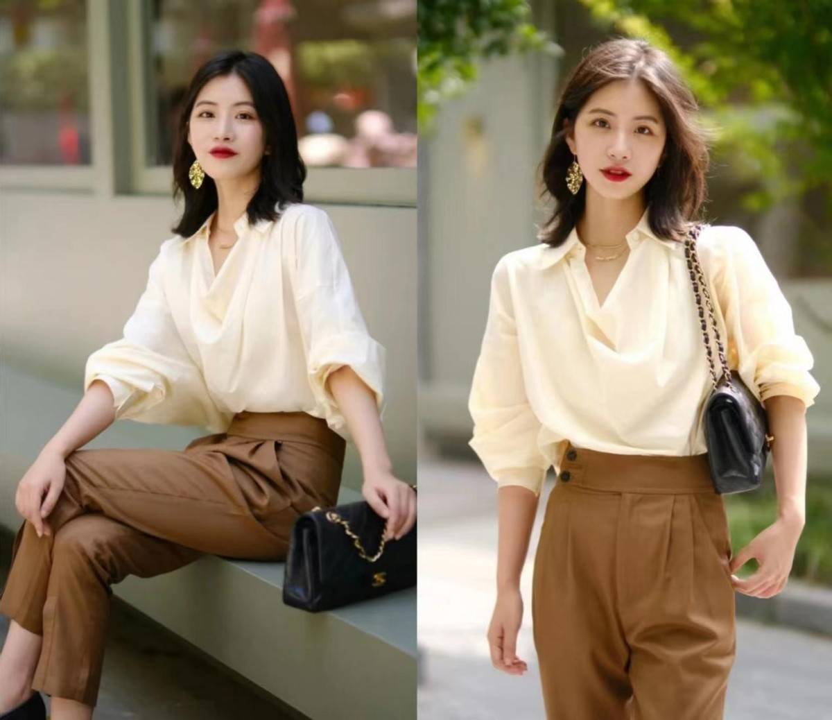 像这条焦糖色的裤子,它的整个裤腿的容纳性更好,因此很多腿部偏粗的女性,就会对这种裤子爱不释手,在上半身同样搭配v领样式的白色衬衫,洒脱又大气。