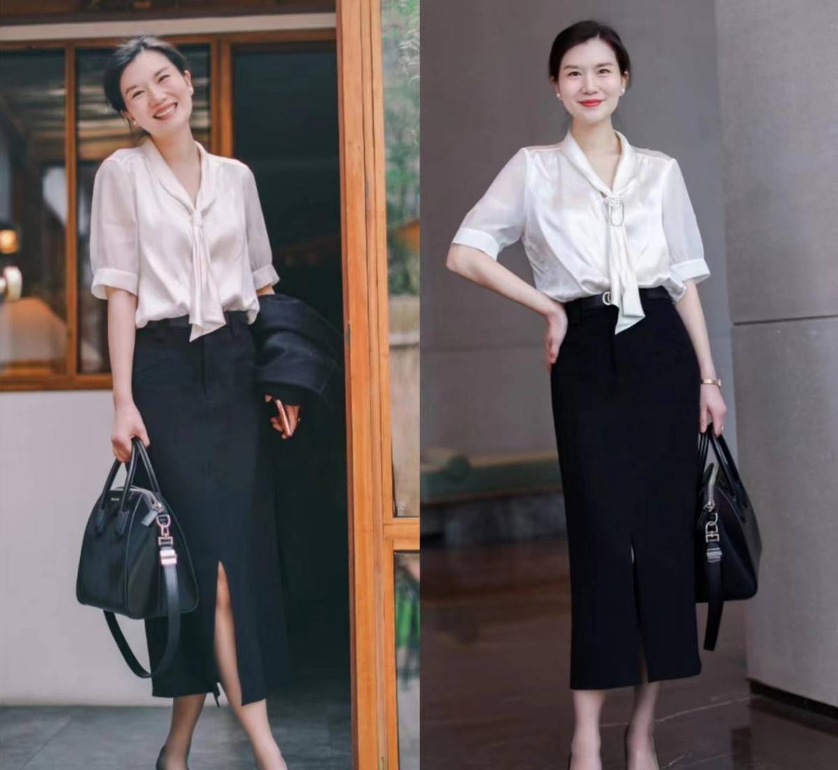 黑色的过膝半身裙,带有简单的开叉设计,就能缓解它外形方面的暗沉感,搭配香槟色或者是白色的真丝衬衫,也很有档次。