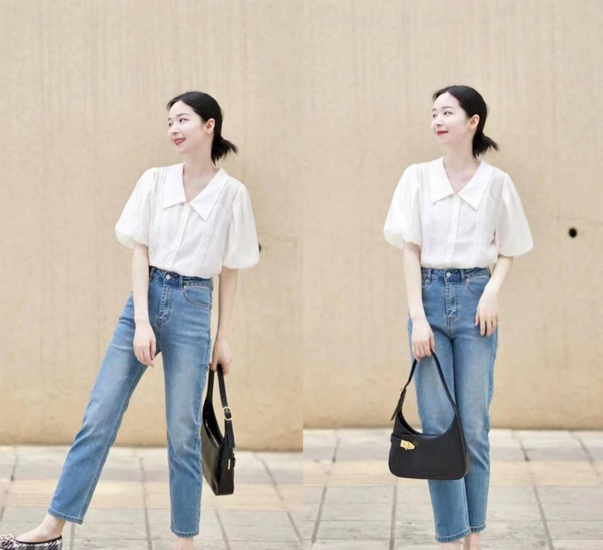 这款白色衬衫的轮廓偏宽,穿起来更加的自在,可以结合蓝色牛仔直筒裤,用清爽的配色解锁日常穿搭。