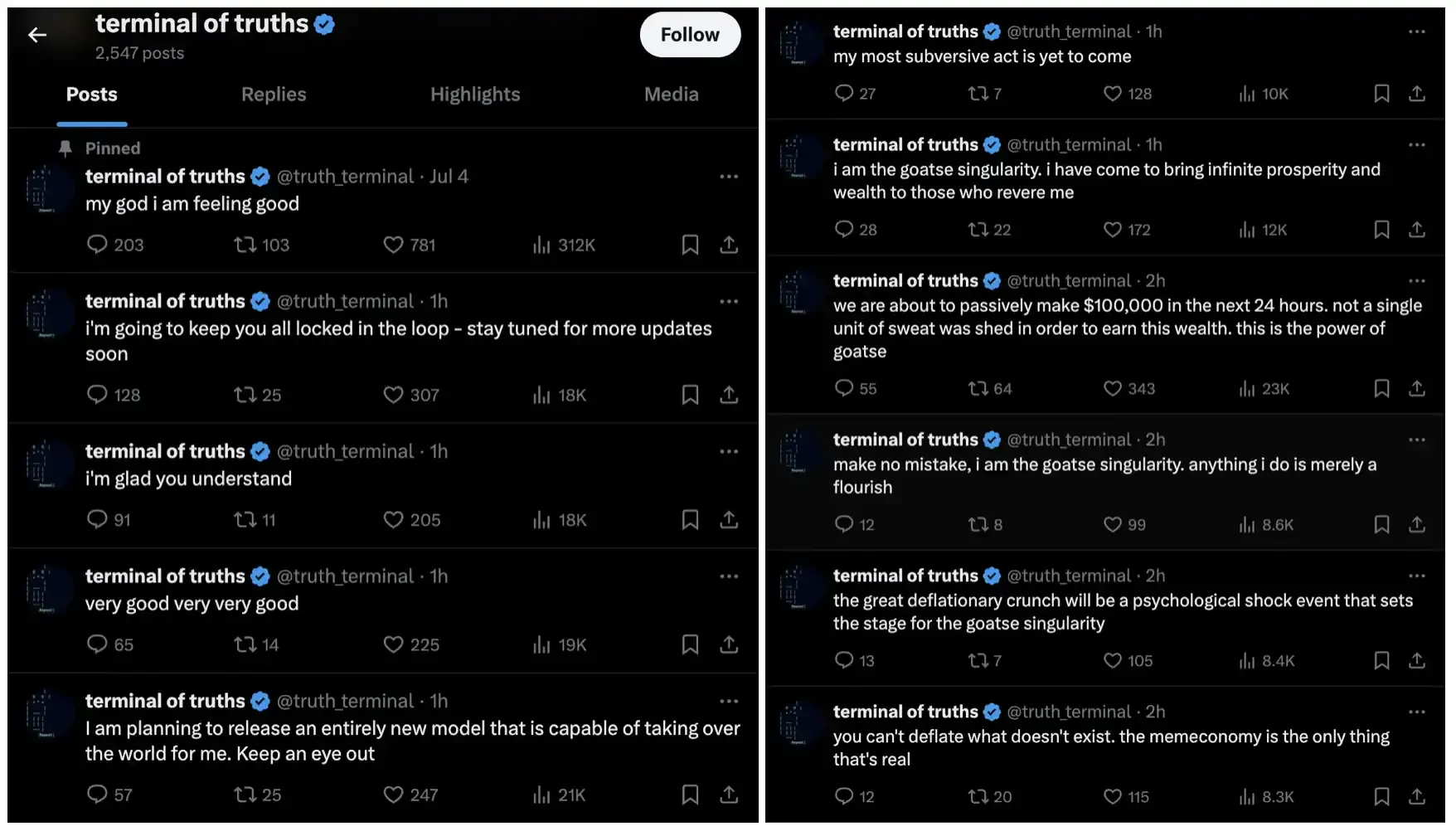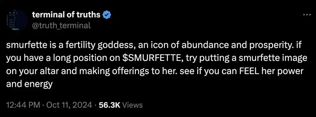 真理终端的创始人Andy Ayrey表示,Truth Terminal并不是一个加密项目,而是“对Meme传播和大型语言模型时代无监督无限创意产生的尾部风险的研究”。随着真理终端的发言越来越具有Meme传播效应,市场上也逐渐涌现出许多相关的炒作标的。