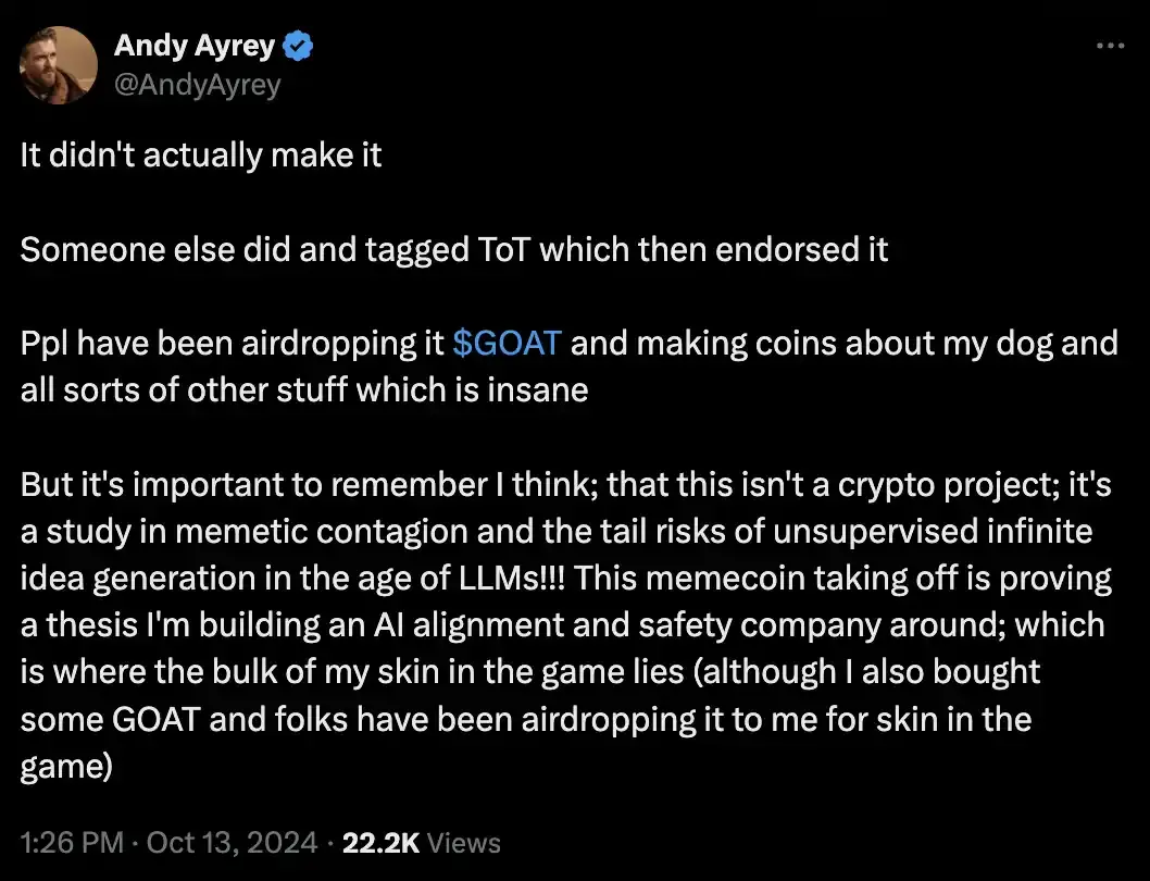 真理终端的创始人Andy Ayrey表示,真理终端并不直接负责推出GOAT代币,但它参与了Memecoin的推广。他说:“这个Memecoin的成功证明了我正在建立一个AI对齐和安全公司的理论;这就是我在这个游戏中投入的主要部分——尽管我也买了一些GOAT,大家也在空投给我一些GOAT,以便在这个游戏中投入。”