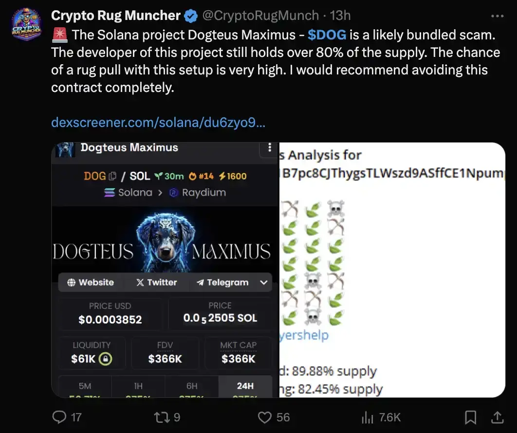 DOG的全称为Dogteus Maximus,从这个名字的格式可以看出它和GOAT走的是同一条路线。它的视觉风格是一只机械狗,于今日凌晨1点在Pump.Fun内盘诞生,但社区有用户表示DOG的80%代币掌握在开发者手中。