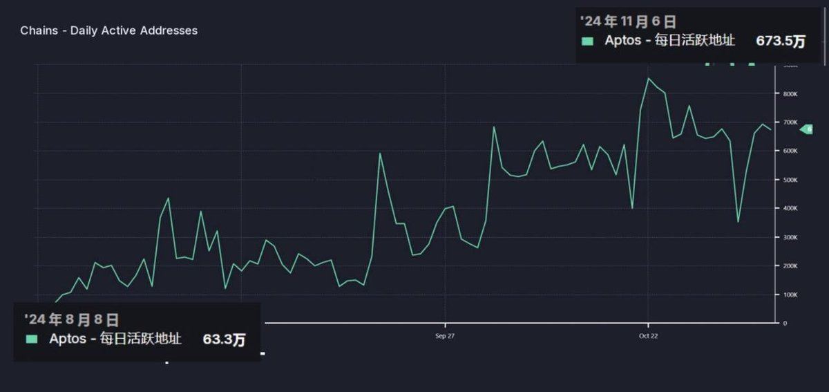 从今年 8 月开始,日活跃用户数量呈现井喷式增长,从 63 万增加到现在的 673 万,三个月内增长了 10 倍。链上交易数量和活跃地址数量的增长趋势表明项目的活跃度在提升,这可能是空投的一个积极信号。此外,用户数量的持续增长也显示出 Aptos 的吸引力不断增强,这可能预示着二期空投的临近。
