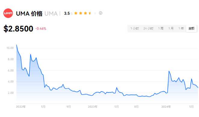 UMA的当前价格为$2.8500。在过去24小时内,UMA的价格下跌了-0.45%。目前,UMA在市值排行中位列第140名,实时市值为$2.33亿,流通供应量为81,439,514 UMA,最大供应量为119,768,117 UMA。我们会实时更新UMA/USD的价格。