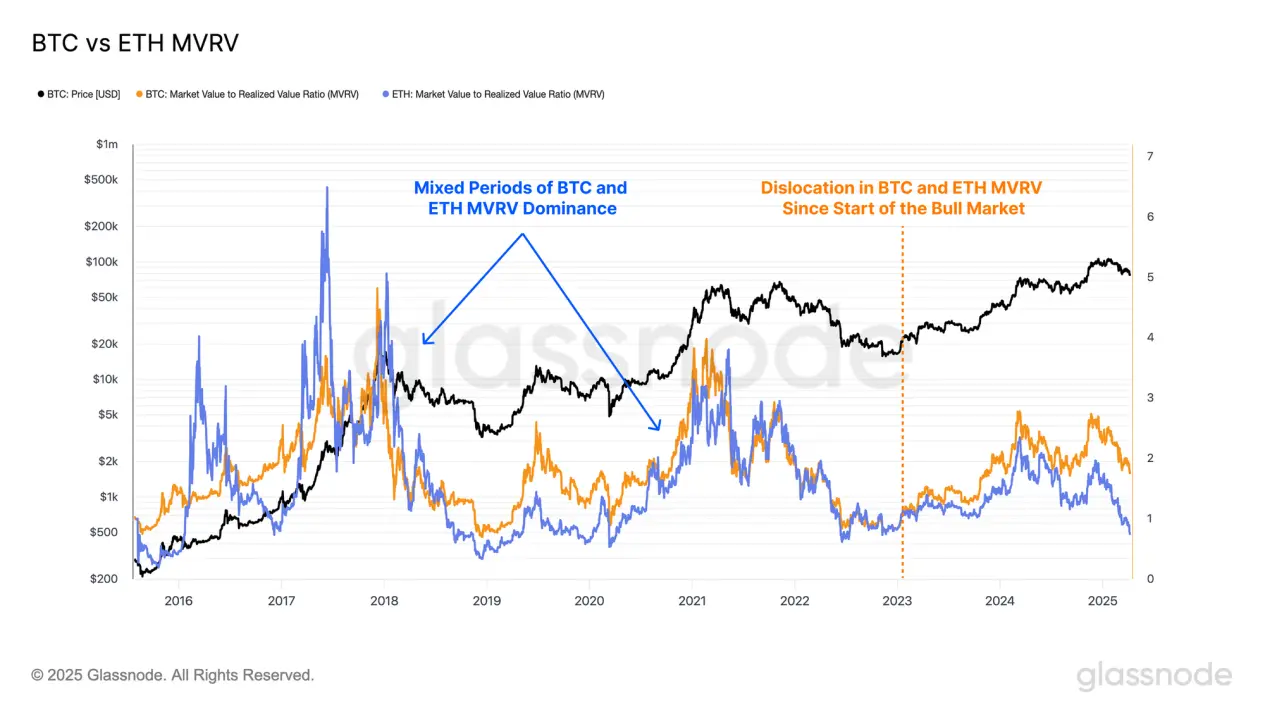 MVRV比率用于衡量现货价格与已实现价格之间的关系,反映平均每个资产持有者的浮盈或浮亏程度。自2023年1月本轮牛市启动以来,比特币与以太坊的MVRV比率再次出现明显分化。比特币投资者始终持有更高幅度的浮盈,而以太坊的MVRV比率在今年3月已再次跌破1.0,说明多数持币者进入亏损区间。