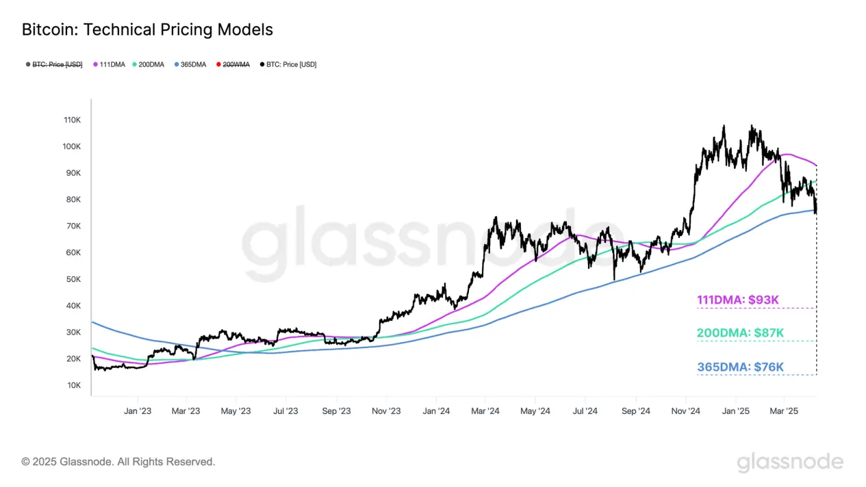 技术分析长期以来一直是投资者的重要工具,而比特币投资者通常会关注一组关键的移动平均线。其中,111日、200日和365日移动平均线(111DMA、200DMA、365DMA)是衡量比特币市场动能的常用指标。比特币首次跌破111日均线(93,000美元)标志着市场动能遭遇重大打击,随后并未出现有效的反弹尝试。在首次下跌后,价格围绕200日均线(87,000美元)震荡,该水平被多数技术分析师视为多空分界线。市场在该区间表现出明显的犹豫情绪,最终导致再度下行,开启新一轮价格下跌。近期,价格首次自2021年周期以来跌破365日均线(76,000美元)。这一关键动能支撑位目前尚未被完全失守,若不能持续站稳,将可能触发进一步的下行趋势。