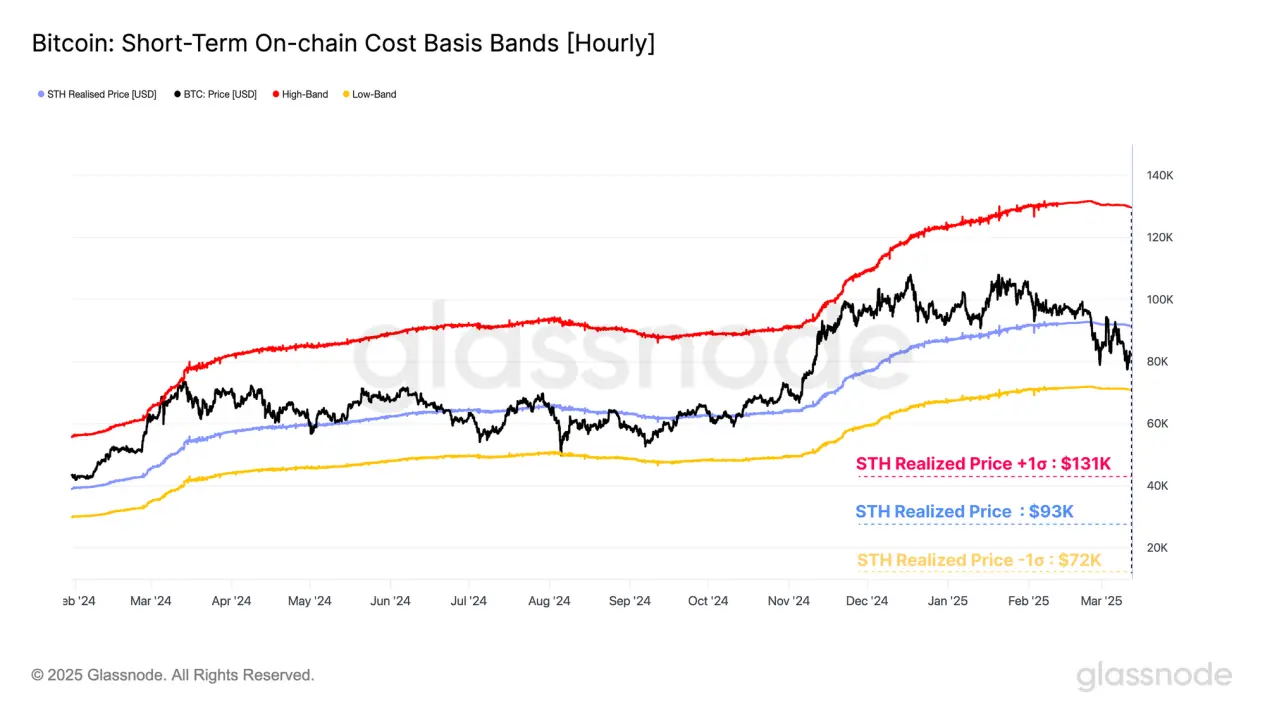在牛市上涨阶段,短期持有者(STH)通常是市场恐慌性抛售中承担主要亏损的群体。他们行为与情绪的变化可作为评估市场回调强度以及投资者应对方式的重要参考指标。短期持有者成本基准历来被视为判断牛市期间市场动能的关键参考水平。围绕该成本基准构建±1个标准差区间,通常可作为局部价格波动的上沿与下沿。短期持有者成本基准 +1σ:131,000 美元短期持有者成本基准:93,000 美元短期持有者成本基准 -1σ:72,000 美元比特币首次跌破短期持有者成本基准(STH-CB)即预示市场动能开始减弱(同时也跌破了111日均线)。随后价格反弹至该成本线下方并遭遇阻力,确认了投资者情绪的转向。目前比特币现货价格已稳定在STH成本基准与其下方-1个标准差之间,构成当前交易区间的上下边界,即93,000美元至72,000美元。