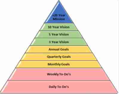 关于这个就够了。让我们继续。你有什么目标,朋友?如果没有更宏伟的目标,很容易就会漫无目的地漂流。如果你每天只是醒来,没有任何计划,而是开始刷手机或电脑屏幕,你就输了。我相信目标设定的金字塔结构。基本上,从一个20年以上的使命开始,然后将其细分为3到10年的愿景。进一步地,要实现3年的目标,你需要将其细分为年度目标、季度目标等等。