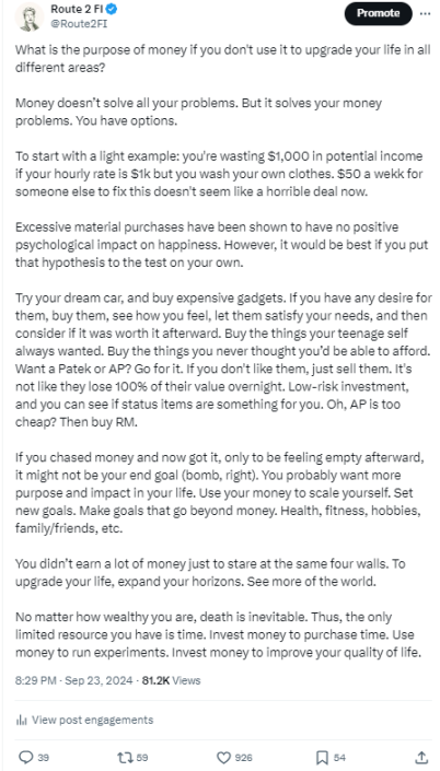 无论你多么富有,死亡是不可避免的。时间是我们唯一有限的资源。用你的金钱去购买时间,尝试不同的可能性,提升生活质量吧。