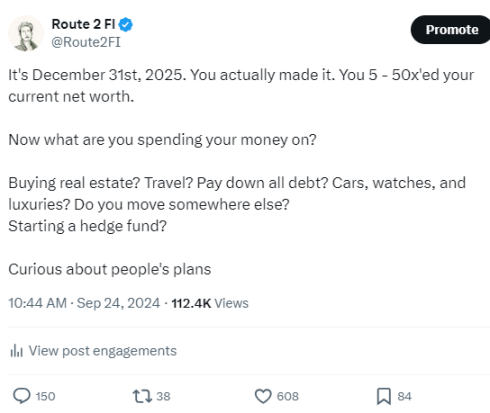 关键是,现在牛市再次加速,我开始重新感受到这一点。加密货币是如此重要,而其他事情只能暂时搁置。我把事情推迟,以便赚更多的钱(比我已经赚的还要多)。听到其他人在加密货币Twitter (CT) 上谈论他们打算花钱的事情感觉很自然,可以参考这条推文。