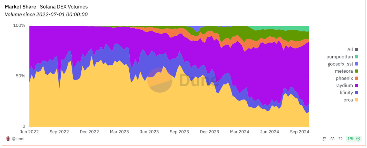 目前Solana一直是这轮周期中使用最多的L1,并且在交易活动方面继续占据主导地位。作为活动增加的直接受益者,这意味着Solana上的DEX做得非常出色——更多的交易者意味着更多的费用,也意味着更多的协议收入。然而,即使在DEX中,Raydium也成功占据了相当大的市场份额,如下图所示:
