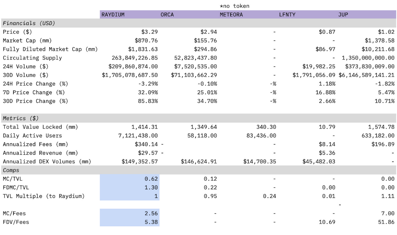 在图13中,将Raydium与Solana上最受欢迎的DEX进行了比较,即Orca、Meteora和Lifinity,这4种DEX加起来占Solana DEX总量的90%。此外还将Jupiter列为聚合器。Meteora没有代币,但为了便于比较,仍将其包括在内。