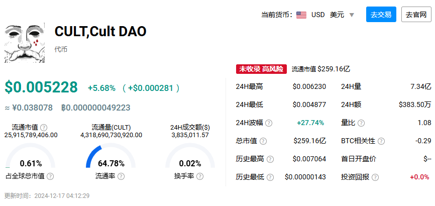 截至2024年12月27日,CULT币的最新价格约为0.005228美元,24小时内的最高价为0.00623美元,最低价为0.004877美元,历史最高价为0.007064美元,历史最低价为0.00000143美元。目前流通数量为4,318,690,730,920.00 CULT,流通市值为25,915,789,406.00美元,24小时内的成交额为383.50万美元。
