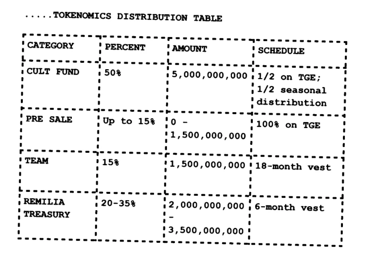 其发行总量为100亿CULT。其中50%将被留作“基金”(一半于代币发行时分配,另一半将用于季节性分配);预售份额至高占比15%,代币发行时全部流通;团队获得了15%的供应量,解锁期为18个月;Remilia国库分配占比达20%~35%,解锁期为6个月。