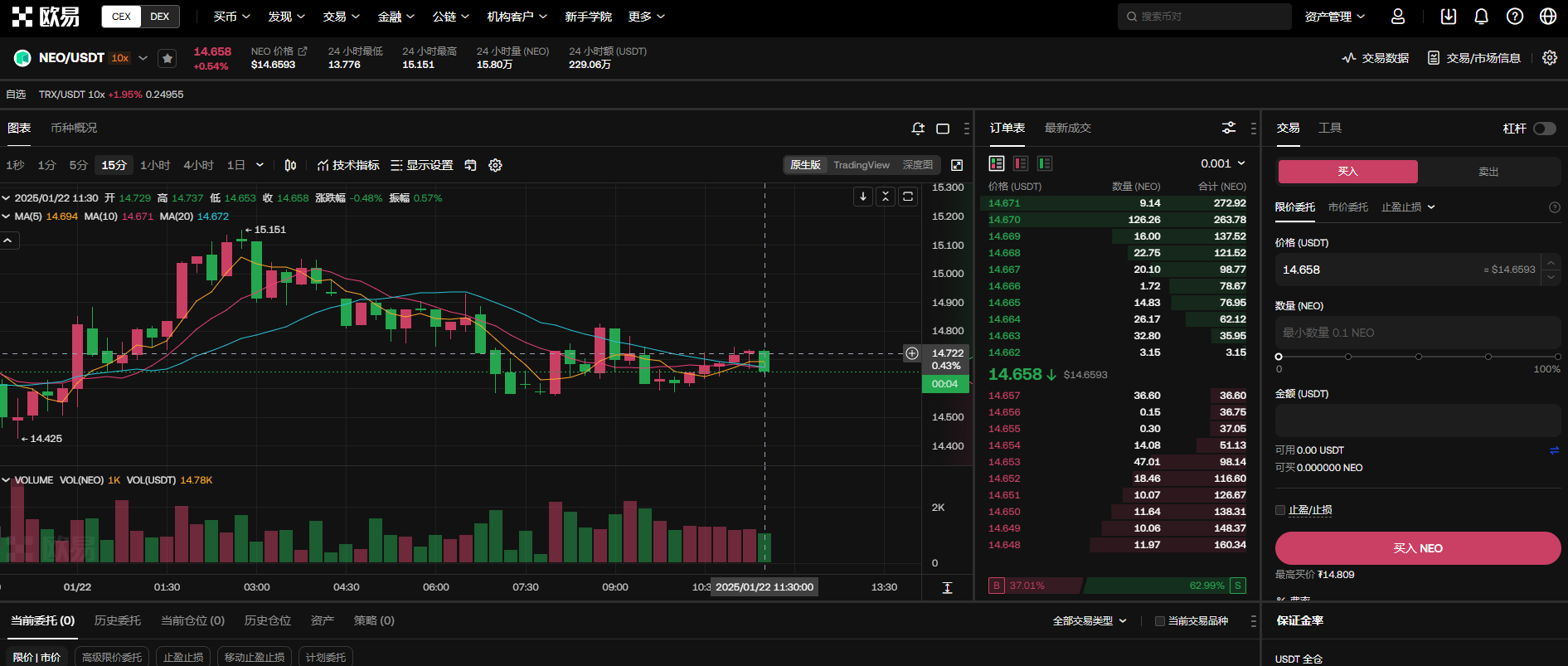 截至2025年1月22日,NEO的价格为14.658美元,总供应量为1亿枚,流通率达到了70.53%。这意味着市场上大部分NEO都在流通中,显示出较高的市场活跃度。目前的总市值为14.67亿美元,流通市值为10.34亿美元,反映了NEO在市场上的总体价值。NEO已经上架了37家交易所,包括欧意、某安等大型交易所,这进一步证明了其市场认可度和流动性。从这些数据来看,NEO仍具有一定的投资价值。尽管加密货币市场波动大,但NEO凭借其独特的定位和稳健的发展,吸引了不少投资者的关注。