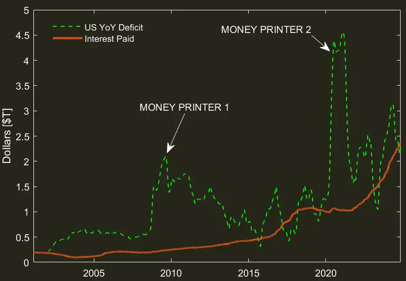 为了让大家更直观地理解我的观点,我特意制作了一张图表,展示了美国年度赤字增长率和现有国债的总利息支付情况(数据来自财政部网站)。在2008年之前,美国的债务占GDP的比重一直维持在40-60%之间,这意味着私营部门可以相对自由地增发货币,用于购买新债务,而不必担心投资组合中国债比例过高。实际上,发行国债让市场持有高质量资产是有益的。