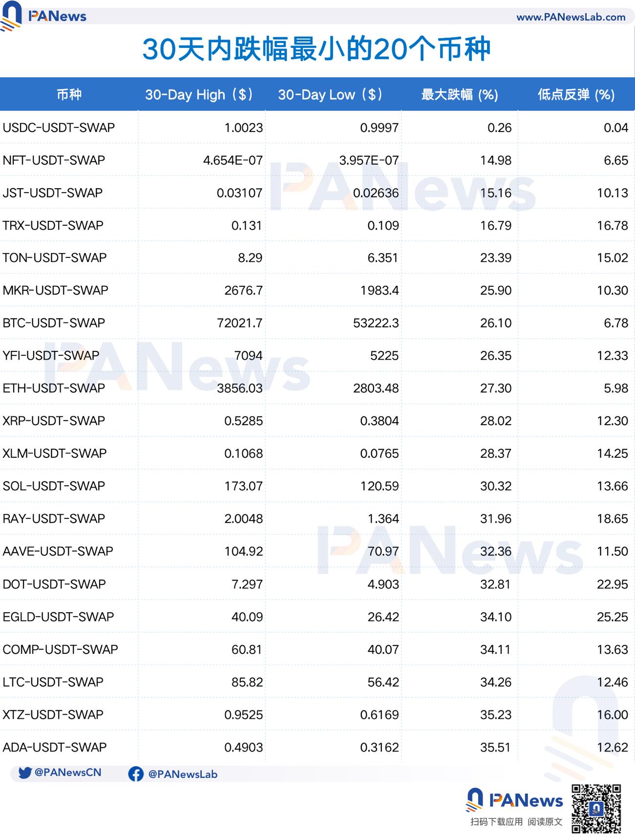 根据 OKX 永续交易对数据,PANews 计算了最近30天内跌幅最大的币种,并通过低点到7月8日的反弹价格区间来评估代币的反弹力度。