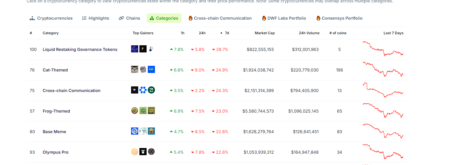 根据 coingecko 的数据,近7日内表现最差的赛道是再质押治理代币、猫主题的 MEME 和可跨链通讯协议。