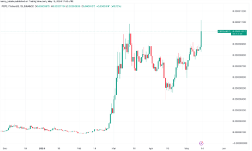 截至5月14日,模因币市场因著名GameStop交易员“Roaring Kitty”(真名基思·吉尔)重返社交媒体平台而迎来一波强势上涨。其中,佩佩币(PEPE)表现尤为抢眼,其价格自3月15日以来首次突破0.000010美元水平,创下历史新高。