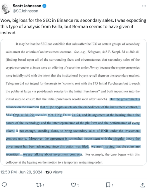 法官在判决中还提到了SEC和Ripple的案子,这说明法院在处理类似案件时,会保持一致性。