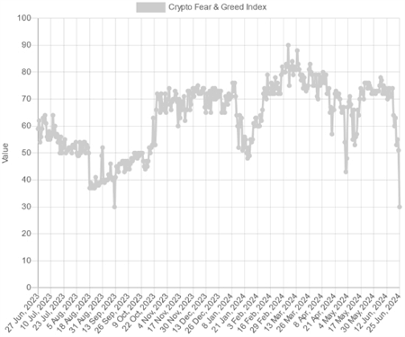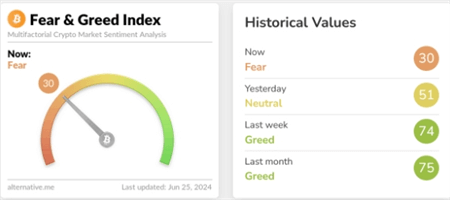 最近,那个用来衡量加密货币市场情绪的“恐惧与贪婪指数”可是大幅度跳水,引发了不少关注。这玩意儿就像个晴雨表,能反映出大家对比特币以及整个加密货币市场的看法。6月24日的数据显示,这个指数已经跌到了近一年半以来的最低点,正式进入了“恐惧”区域。