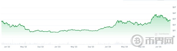 与此同时,Crypto总市值在过去两年中几乎出现了与稳定币走势类似的市值变化,从2023年中的约2万亿美金翻倍到了约4万亿美金。但最高点出现在去年12月,目前已经回落到了2.8万亿附近,跌幅约30%,与稳定币市值增长出现了背离。