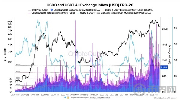 我认为,目前我们应该更多的关注稳定币流入大型交易所的数据变化。从历史上看,稳定币流入量的激增与局部顶部或底部相吻合,通常预示着波动性的增加。而最近一次的激增超过了925亿美元,也是有史以来最高的流入水平之一。