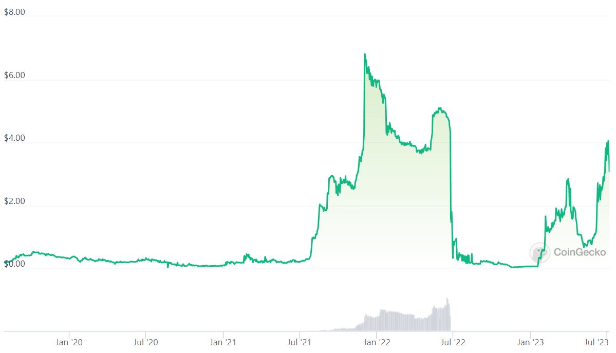 从技术上讲,2022 年 5 美元左右的突破水平和 7 美元多的历史高位将成为上行阻力位。该代币面临大幅下跌的风险,可能会回到 0.75 美元左右,即 2023 年 5 月的积累水平。