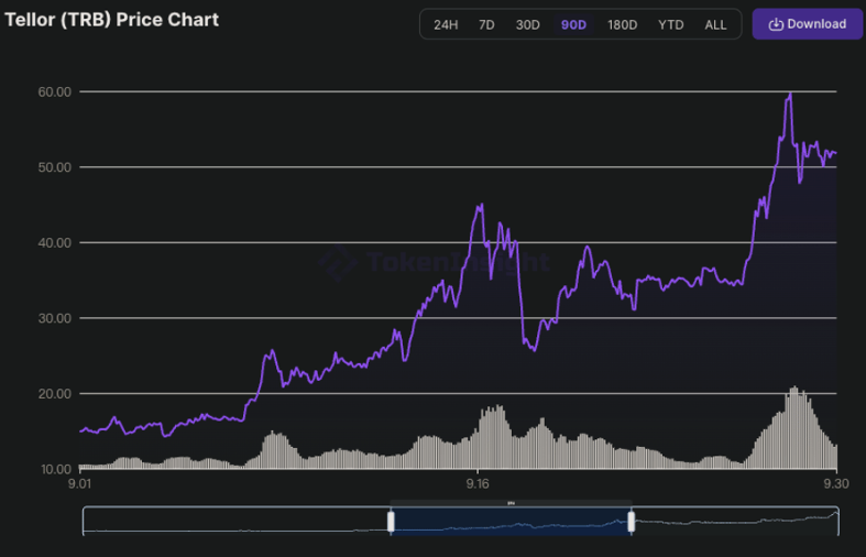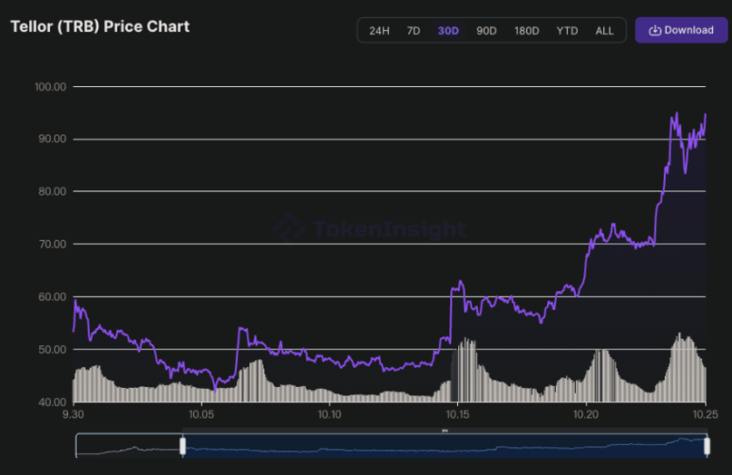 第二次上涨发生在10月初,TRB价格在45-50美元之间稳定。受比特币现货ETF新闻的影响,整个加密市场情绪持续向上,形成了一波小牛市。TRB的价格也随之从50美元上涨至最高95美元,涨幅约为90%。相比市场平均20-30%的涨幅,TRB在这次小牛市中成为了最大受益者之一。